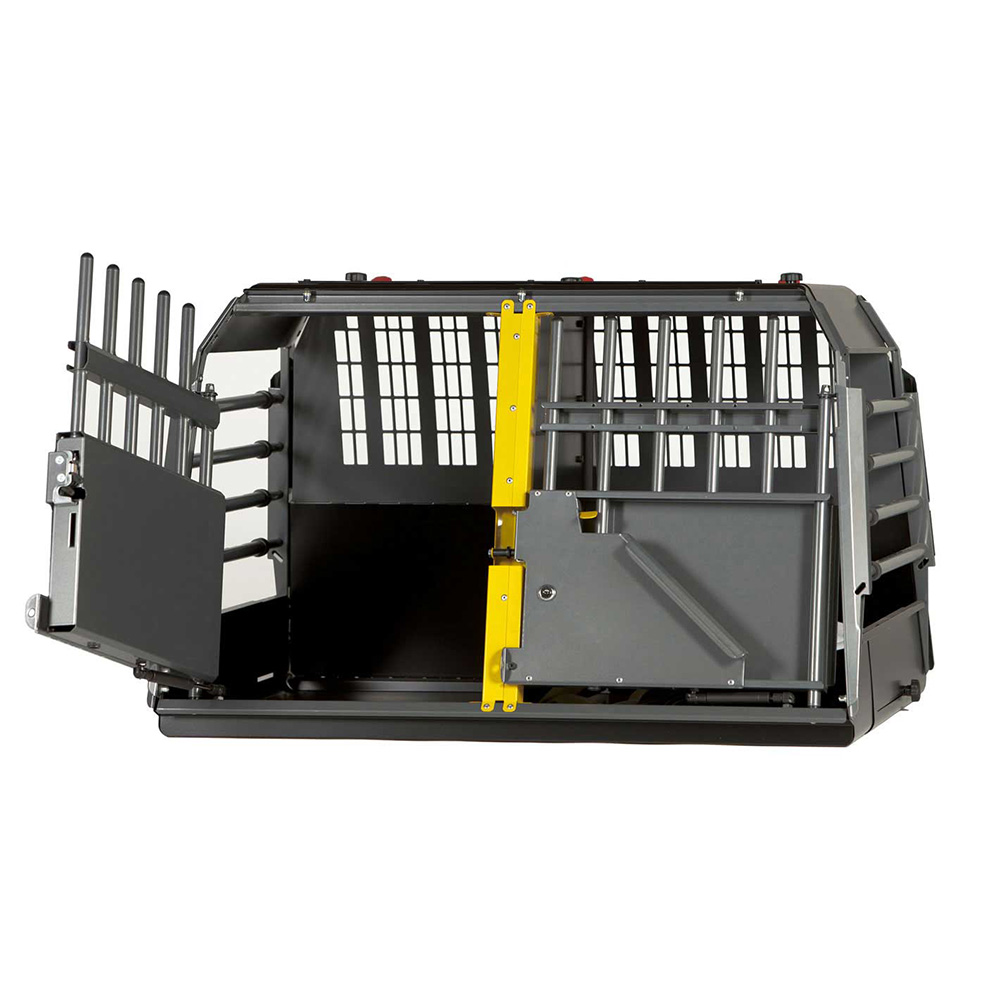 Två hundar kan sitta åtskilda utan att nå varandra. Om en av hundarna behöver mer utrymme än den andra kan avdelaren justeras i sidled. Avdelaren kan också tas bort för att ge en stor hund hela utrymmet.